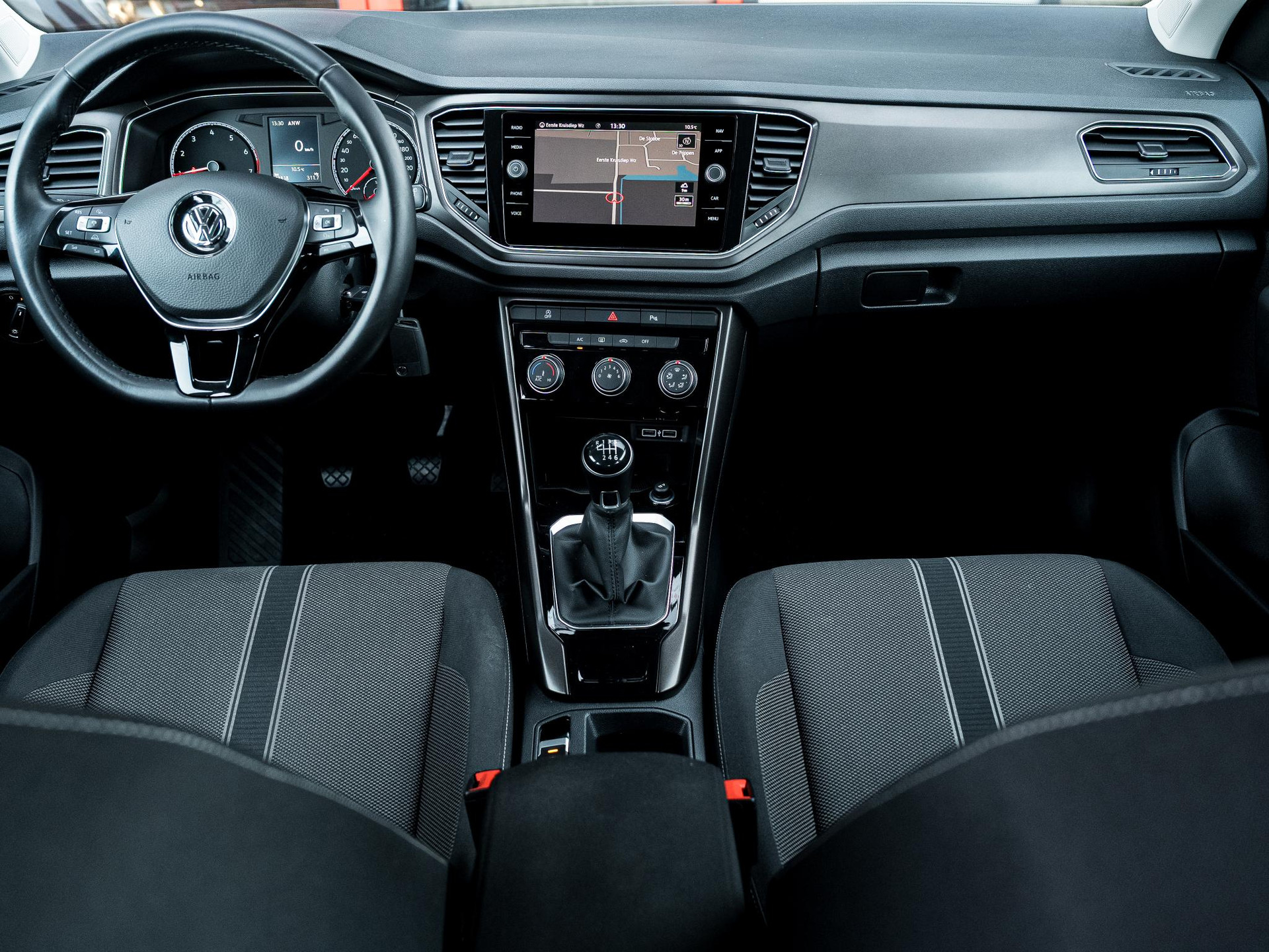 Adaptive cruise control houdt de ingestelde snelheid vast en houdt afstand tot het voertuig voor u. In deze T-Roc vindt u schakelaars op het stuur om het navigatiesysteem te bedienen en het audio-installatiesysteem met DAB-ontvangst. De aanwezige parkeersensoren zijn de ultieme hulp om te laten weten hoeveel ruimte er nog is om te manoeuvreren. Het hoort bij een intelligente auto als deze dat hij zelf in staat is om zijn omgeving in de gaten te houden. Dat doet deze Volkswagen met een automatisch inschakelbare verlichting en een regensensor. Natuurlijk is er in deze auto airconditioning aanwezig. En dan is deze auto ook nog eens voorzien van automatisch dimmende binnenspiegel, lederen stuur, centrale deurvergrendeling met afstandsbediening, boordcomputer en lederen versnellingspook.